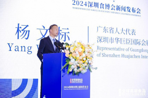 广东省人大代表、深圳市华巨臣国际会展集团有限公司总裁杨文标先生发言,华巨臣集团立足深圳20年,始终坚持“品牌化、市场化、专业化、国际化”发展理念,希望以展会为桥梁,把“好文化、好产品”向全球分享。去年,华巨臣集团承办了由深圳市政府重点支持的全球高端食品及优质农产品(深圳)博览会,邀请了来自36个国家和地区的优质展商及43个政府展团参展,吸引了超过16万观众到场参观,举办了超过160场系列产销对接活动,展会现场签约金额近300亿元。得到各级领导、合作伙伴、国内外嘉宾及社会各界广泛好评,成为食品类专业展会新标杆。今年以“环球美味,点食成金”为主题的2024深圳食博会将于12月7日至9日在深圳会展中心(福田)举办,汇聚来自国内外的高端食品和优质农产品,并同期重磅打造“2024湾区国际咖啡文化节 ”。热烈欢迎特色优质农产品产区政府及各大品牌企业通过深圳食博会平台展示品牌、产品、技术和理念,进一步开拓湾区及国际市场,共同打造一个规模大、规格高、专业化、品牌化、国际化的食品及优质农产品领域的全球贸易盛会。