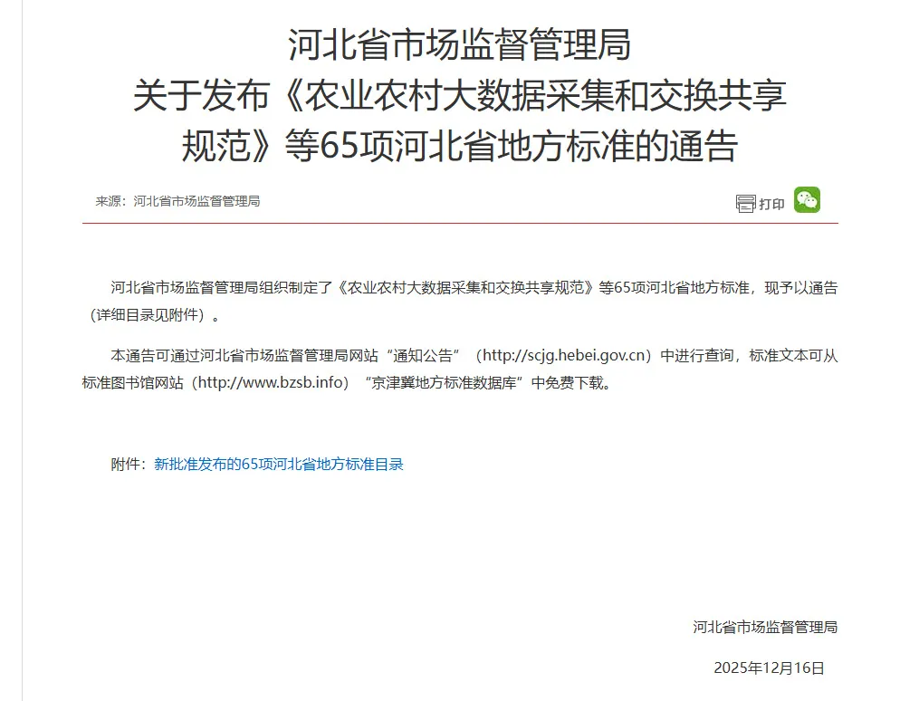 近日,河北省市场监督管理局正式发布2025年第24号通告,由世窗信息联合河北省农业信息中心、河北农业大学共同编制的《农业农村大数据采集和交换共享规范》(DB13/T6190-2025)成功获批省级地方标准,将于2026年1月16日正式实施。这一标准的落地,不仅填补了河北省农业农村大数据领域的标准空白,更标志着我省农业农村大数据建设告别"数据孤岛"时代,迈入标准化、规范化、集约化发展的全新阶段,为全国农业数字化转型提供了可复制、可推广的"河北样本"。